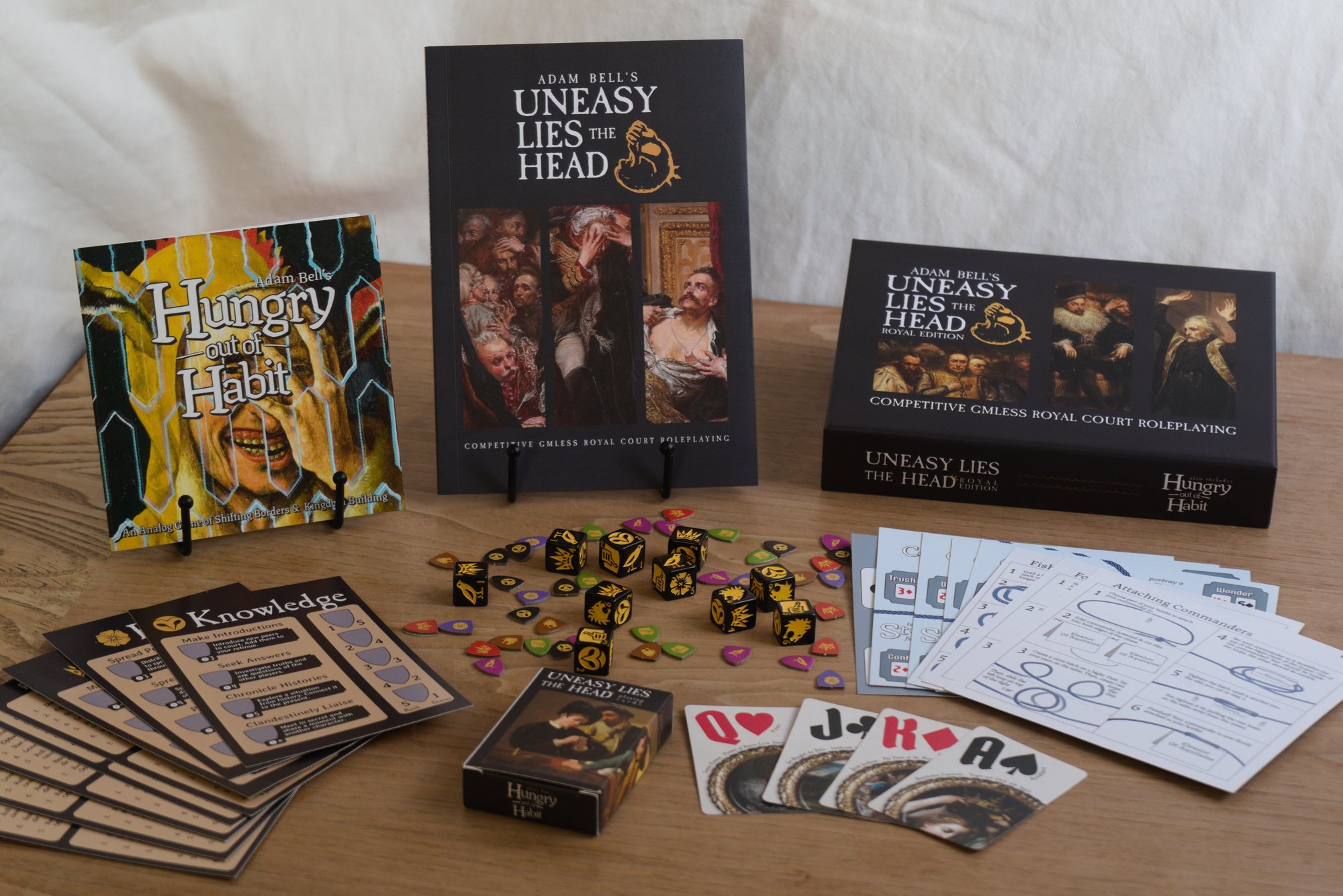 The Royal Edition boxed set includes playing cards, playsheets, custom dice, and the companion game Hungry Out of Habit.